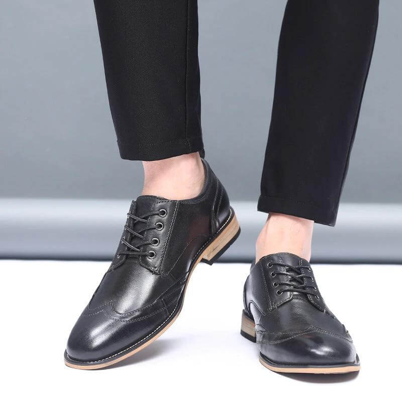 Classic men's lace-up dress shoes crafted with cowhide upper and rubber sole for everyday office and formal wear. Available in black and brown with a leather toe cap and low upper height.