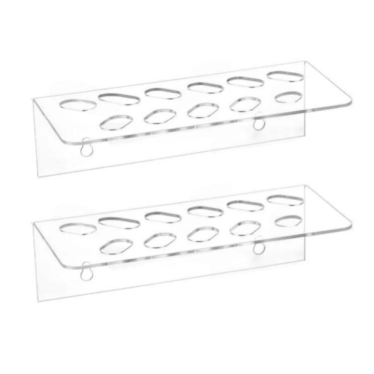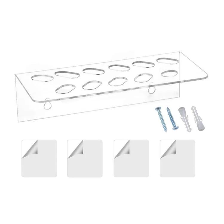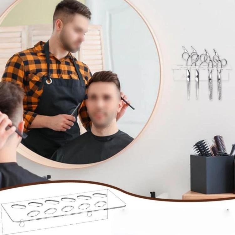 This wall mounted acrylic scissor organizer rack for barbers has 11 holes and a compact footprint to keep cutting tools visible and accessible.