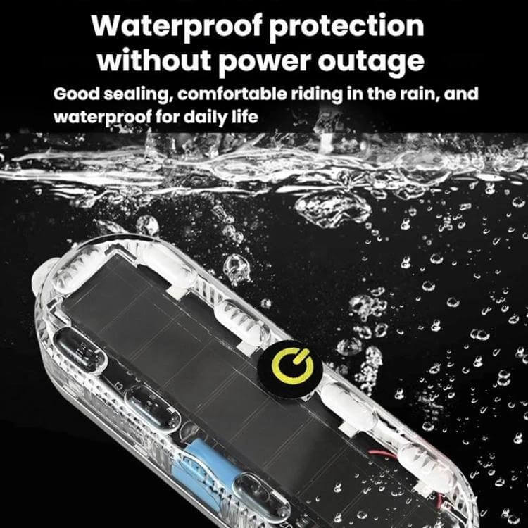 Light specs: RGB LEDs provide color-changing signaling. Each unit measures 9.8 x 2.8 x 1.4 cm; solar panel charges during daytime for battery-free operation.