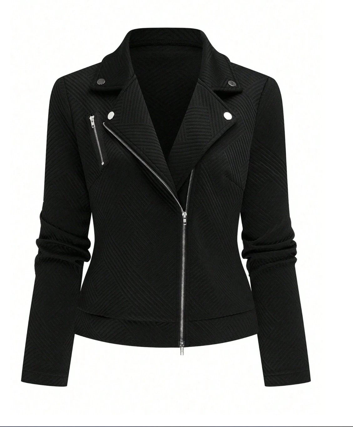 Esta chaqueta casual para mujer ofrece una opción práctica para el uso diario, con una cremallera oblicua y una silueta delgada en tela de poliéster negra.