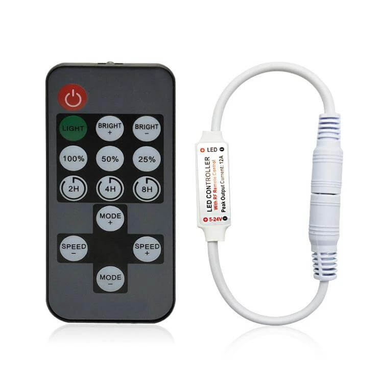 The 14 Key RF Timer Dimmer for LED Strip Lights with Remote Control provides timed dimming for 5–12 V LED strip installations. It uses a DC input and a single output circuit to adjust brightness and scheduling without wired controls.