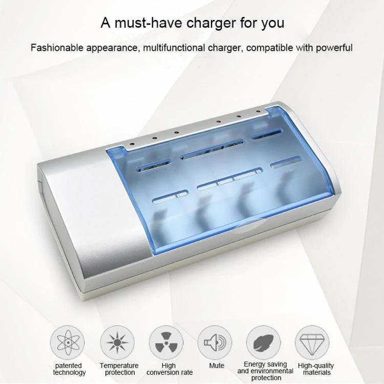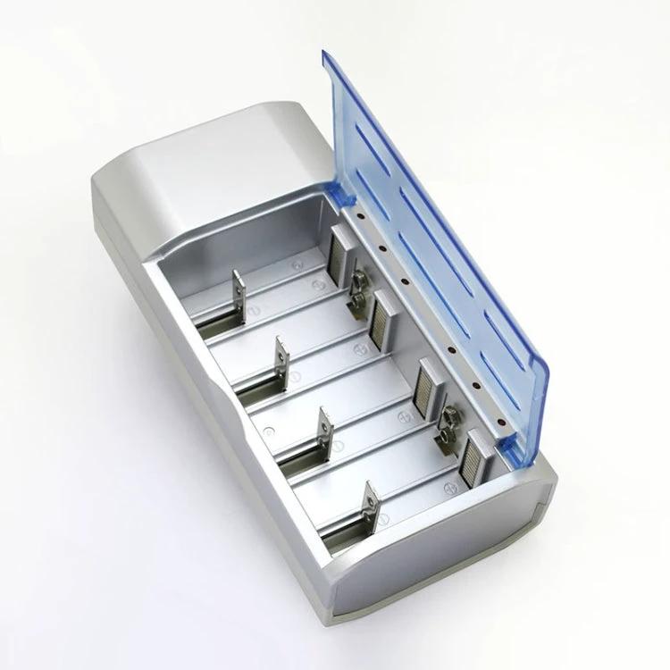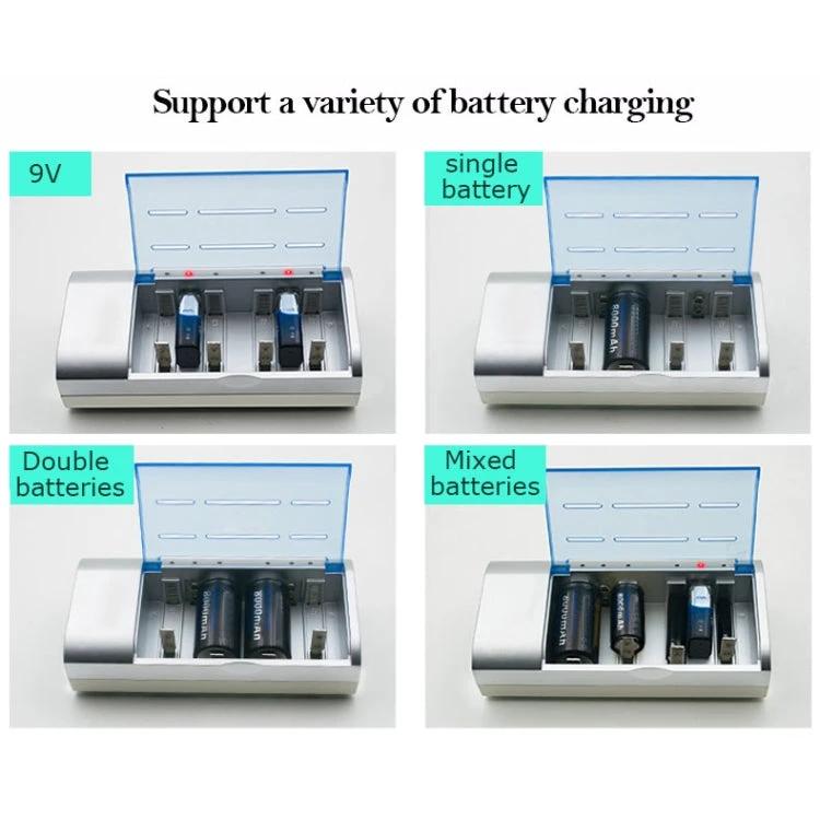 This 4-slot battery charger accommodates AA, AAA, C, D, and 9V batteries, offering flexible charging options with an EU plug for easy use in compatible regions.