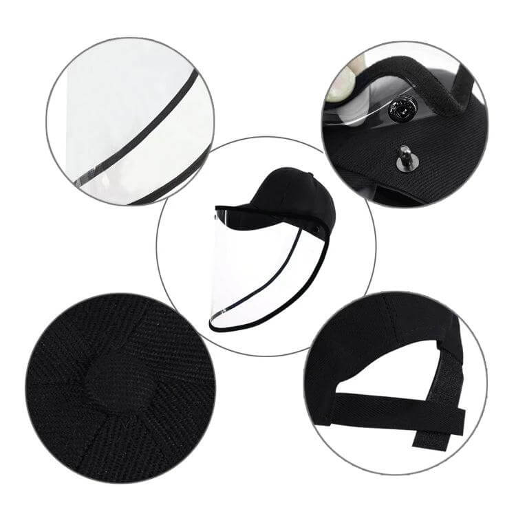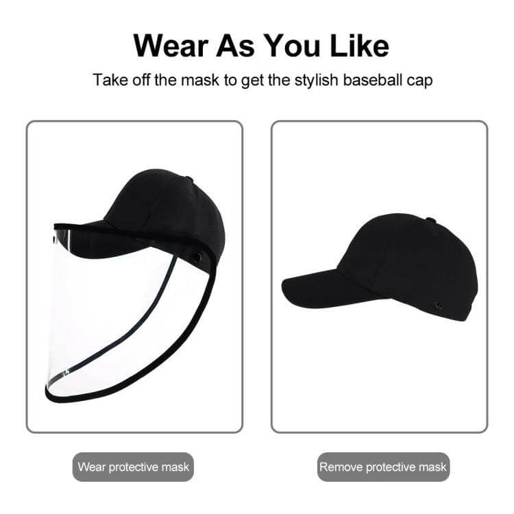 The Baseball Cap Mask With Removable Face Shield combines a cotton hat with a transparent TPU shield for everyday use. It offers a wide brim, clear visibility, and front- and side-spray protection.