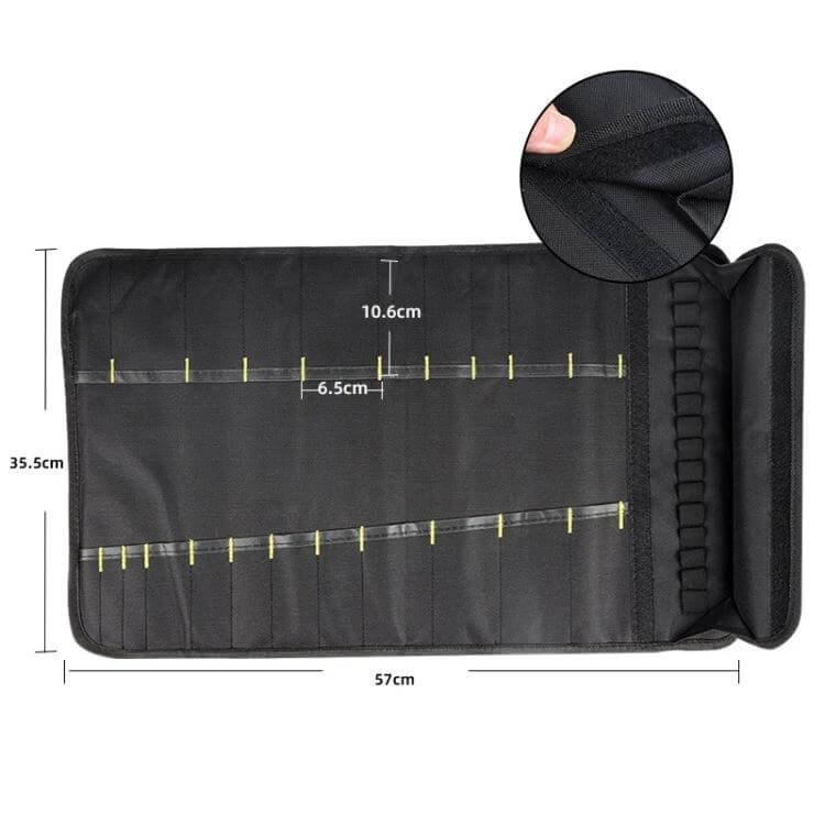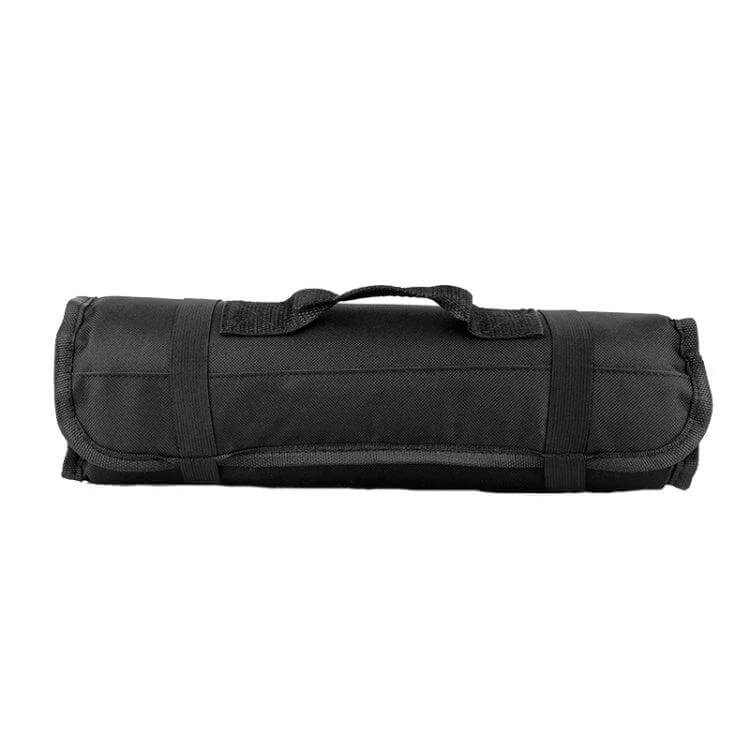 Ideal for home cooks, students, or travel setups, it keeps knives organized and protected when transporting between the kitchen, class, or campsite. Unfolded, the bag measures about 57 x 35.5 cm.