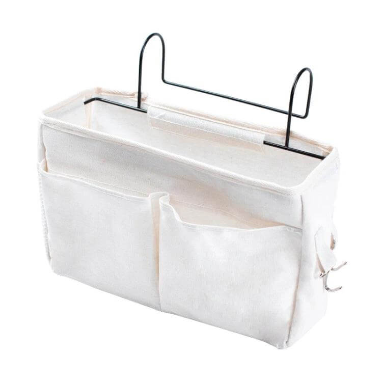 This dormitory bedside storage bag offers a compact, practical solution for keeping essentials within reach. Made from a cotton and linen blend, it attaches to the bed area with a pasteable backing and includes an iron hook for added support. Only the storage bag is included.