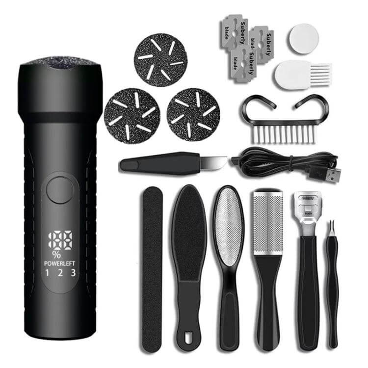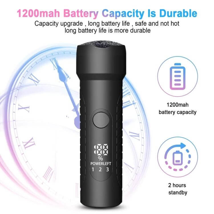 Use it to remove dead skin, calluses, and cuticles on heels, soles, and arches. The LED display shows real-time speed and battery status, while three-speed settings adapt to your routine. Safety features include overcharge/over-discharge protection and heavy-pressure detection.