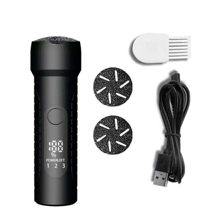 An electric foot file designed for home pedicure care. The white, handheld unit combines USB charging, a 1200 mAh battery, and three interchangeable grinding heads for targeted foot care.