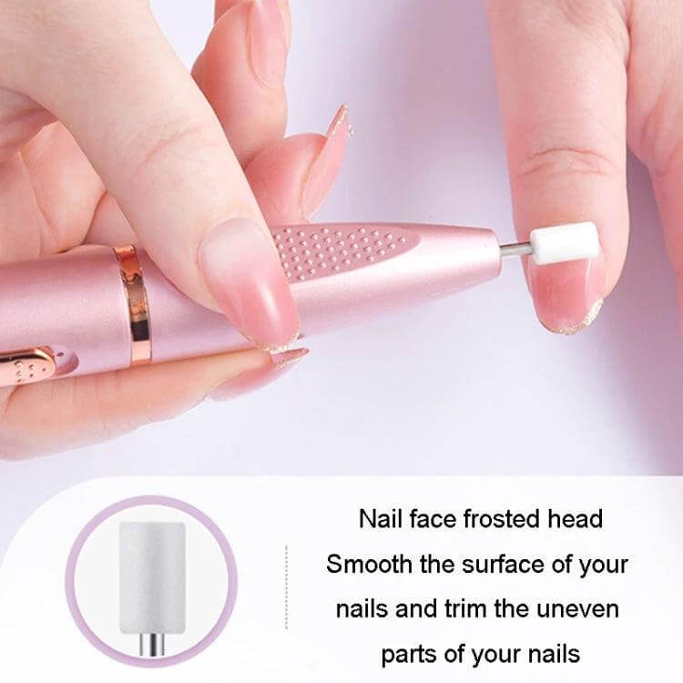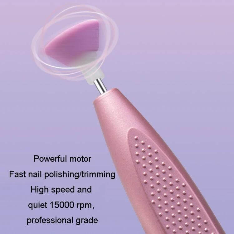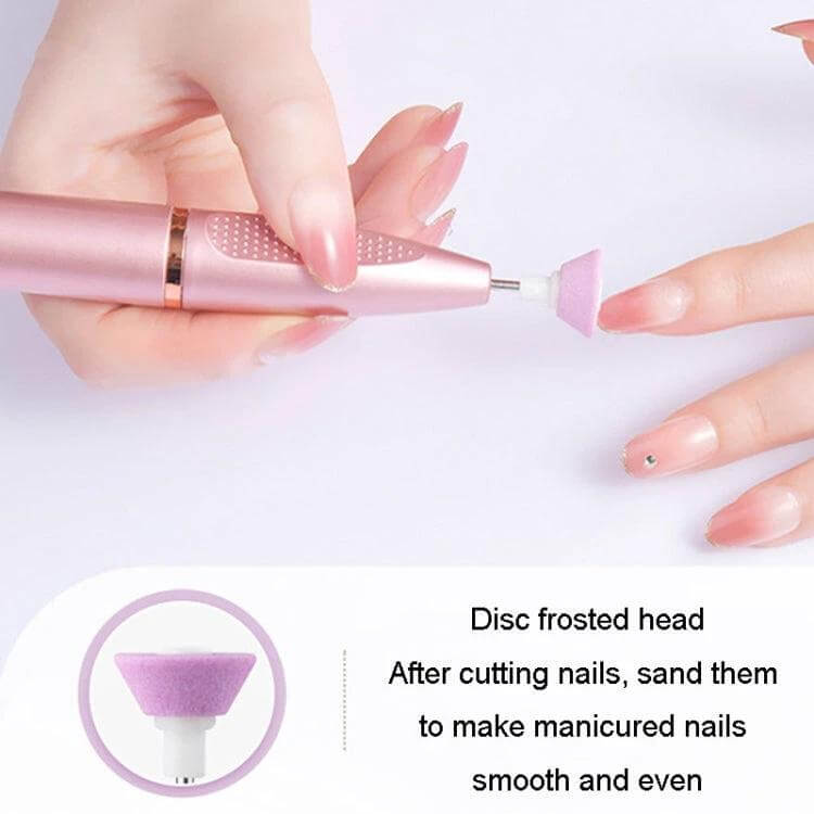 Five interchangeable grinding heads for shaping, filing, buffing, cuticle care, and repair removal.