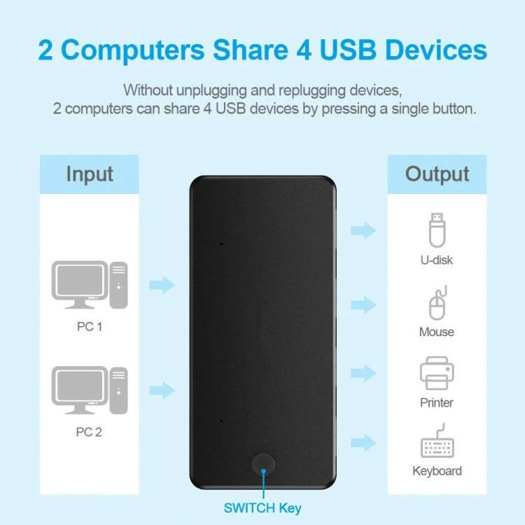 - Allows two computers to share up to four devices, enhancing connectivity options
