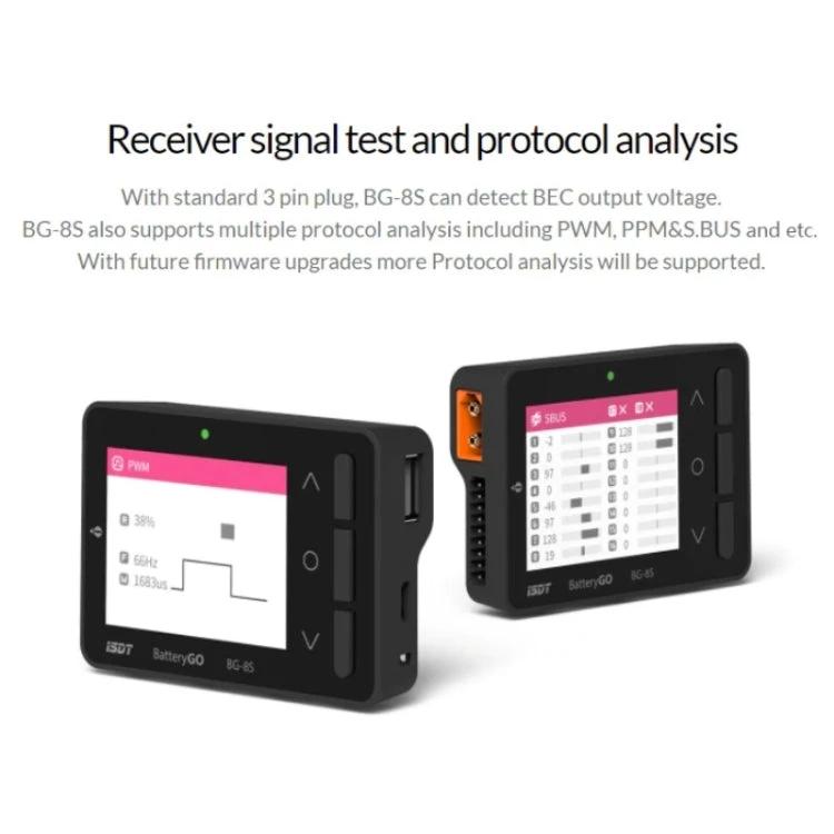 - Offers receiver signal testing for protocols like PWM, PPM, and S.BUS, plus automatic low-power mode after balancing.
