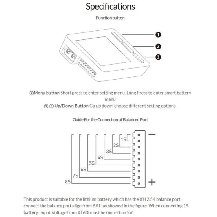 - Supports a wide voltage range of 0.8V to 36V across 1-8S batteries, including LiPo, LiFe, LiHv, Lilon, and NiMH/Cd types.