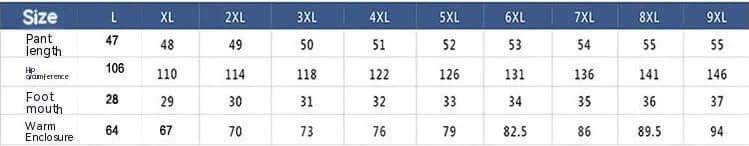 Size range: L–9XL covering approx. 120–310 kg size bands.
