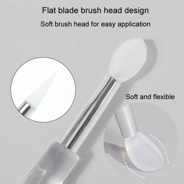 Ideal for rubbing powder into nail designs, applying subtle eyeshadow, or smoothing lip gloss. The flat leaf brush head provides steady coverage without dragging, while the transparent silicone tip wipes clean between uses. Note: brush only; other items not included.