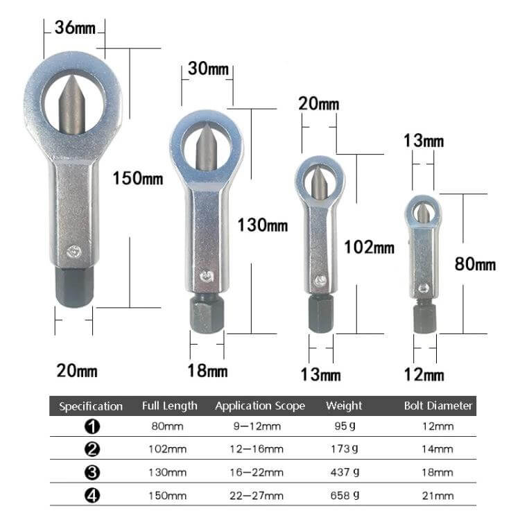 The Nut Separator Breaker Set is a four-piece steel toolkit designed to tackle rusted nuts. Built for durability and straightforward operation, it helps remove seized fasteners without chiseling or damaging surrounding parts.