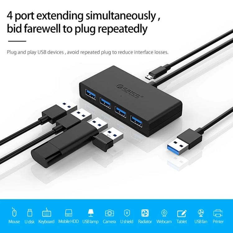 The ORICO 4-Port USB 3.0 Hub expands your device's connectivity by adding four USB ports, helping you manage multiple peripherals efficiently.