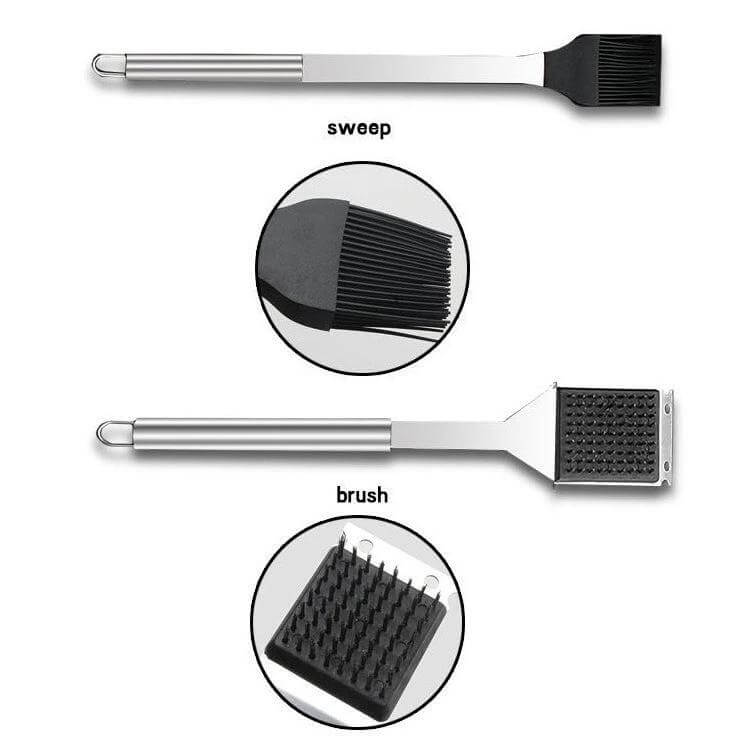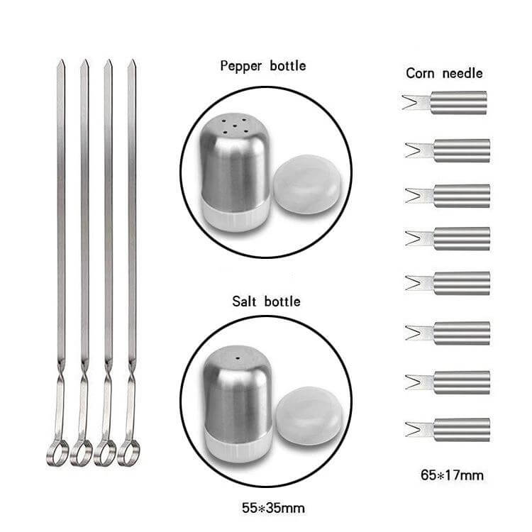 - 20-piece set: includes 6 stainless steel utensils (clip, shovel, sweep, fork, knife, brush), 4 sticks, 8 corn needles, and 2 spice bottles.