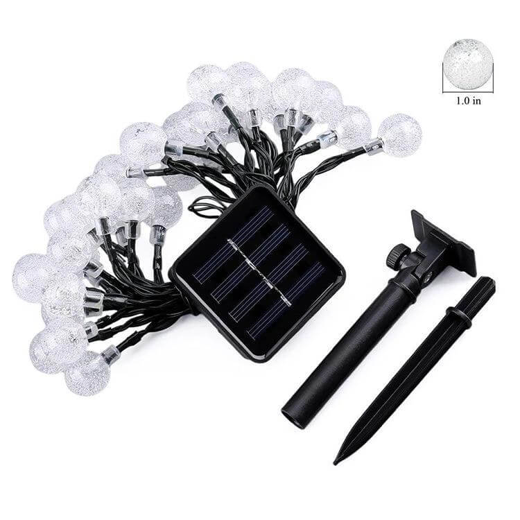 Solar Bubble Ball String Lights provide outdoor illumination with 50 bubble-style LEDs on a 7 m dark-green cord. Built with ABS shells and IP65 protection, these lights are designed for patios, gardens, and walkways.