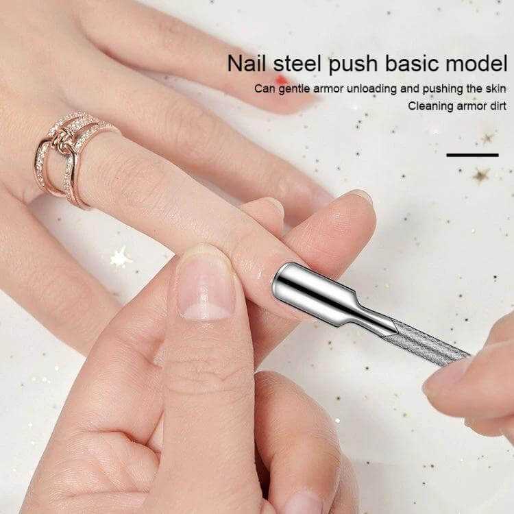 - Flat head pusher: removes surface residues and cleans the nail surface.