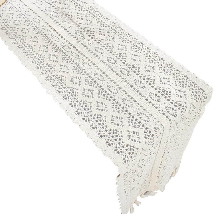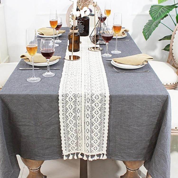 This tassel lace floral table runner is a crochet cotton-blend accessory that softens and decorates dining and console spaces.