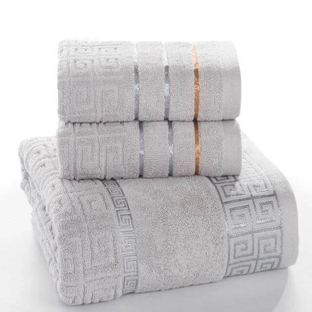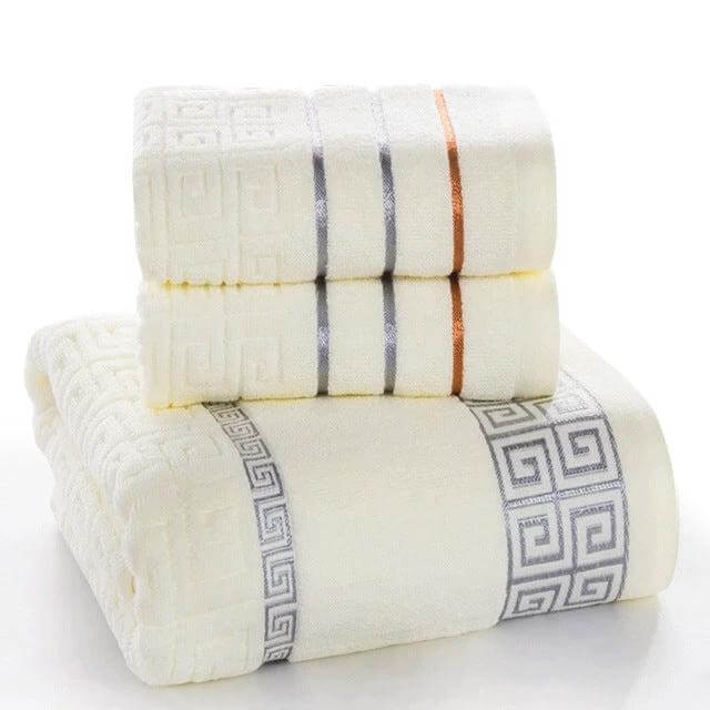 This Three-Piece Cotton Towel Bath Set is designed for everyday bathroom use. The plain styling emphasizes practical softness and reliable absorbency.