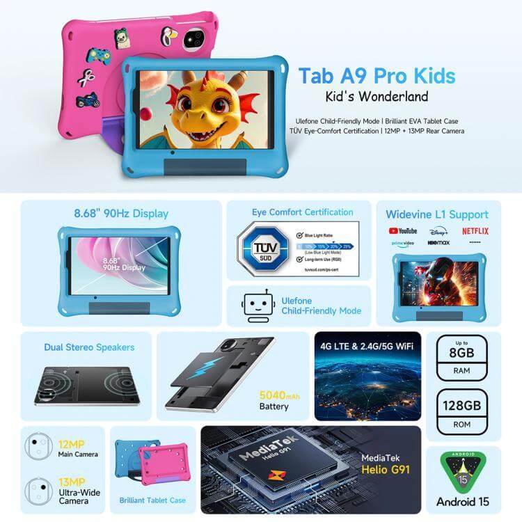 The Ulefone Tab A10 Pro is a tablet tailored for children's learning and play, featuring a robust build and essential tools for educational activities.