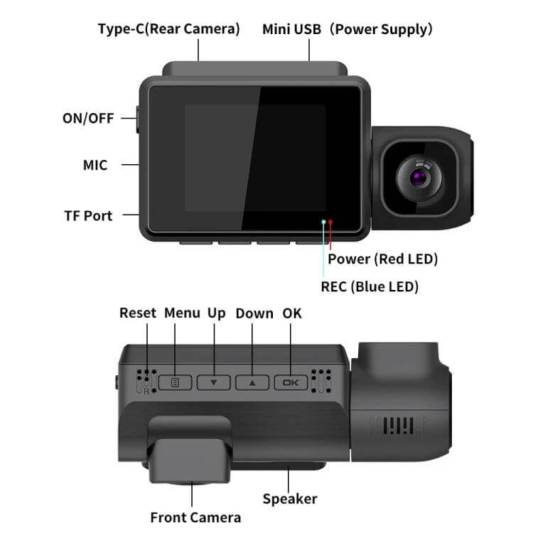 This three-channel dash cam captures front, interior, and rear views for effective vehicle monitoring and recording.