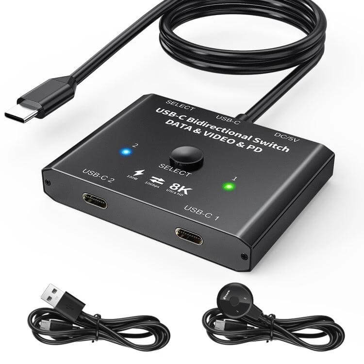 This USB-C bidirectional switch allows you to manage connections between devices and displays efficiently. It operates in two modes: as a switch to connect two source devices to one monitor, or as a splitter to link one source device to two monitors, though only one monitor can be active at a time.