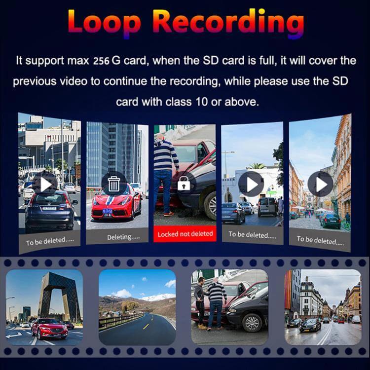 - Built-in G-sensor automatically saves footage during sudden impacts.