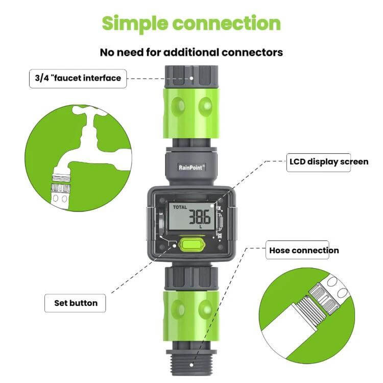 Specifications: Display is a high-precision LCD; Accuracy is 1/10 gallon; Interface is 3/4" faucet; Waterproof rating IPX6; Power is CR2032 battery included; Battery life 12 months or more.