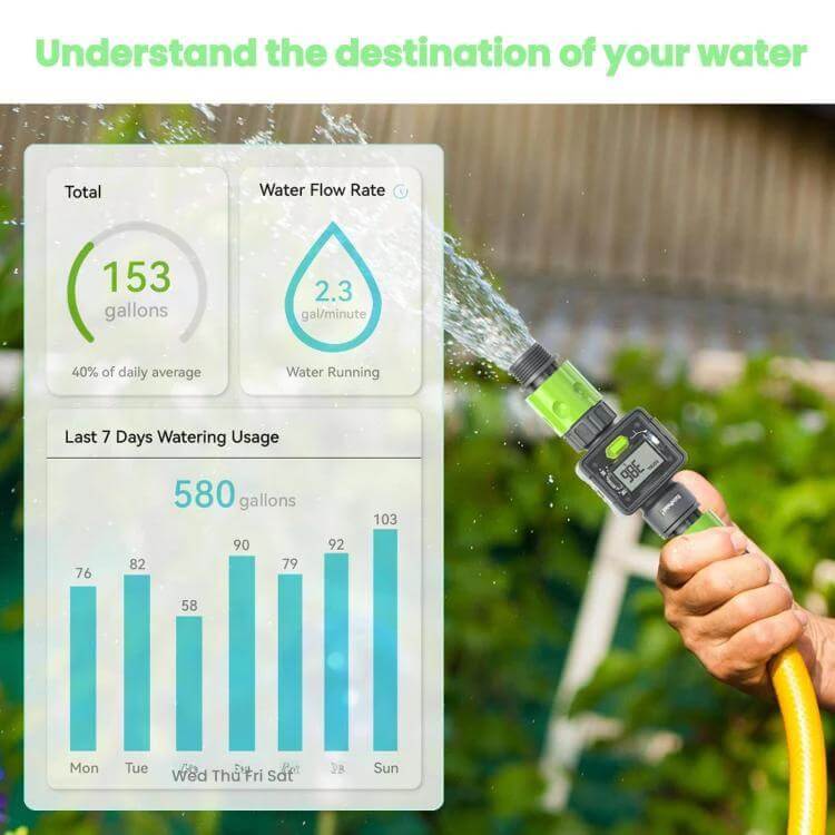 Use it while watering flowers, washing cars, or performing yard tasks. It measures real-time flow, last use, total consumption, and a 7-day average to help you monitor water use and detect anomalies.